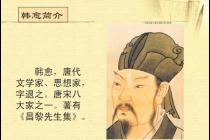 韩愈(768—824),唐代著名的散文家、诗人。字退之,河南河阳(今河南孟县)人。祖籍昌黎(今河北昌黎),常自称“昌黎韩愈”,故人们称之为韩昌黎。因他最后官至吏部侍