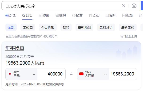 这是百度提供的汇率转换工具,目前来说40万日元等于24744.81元人民币